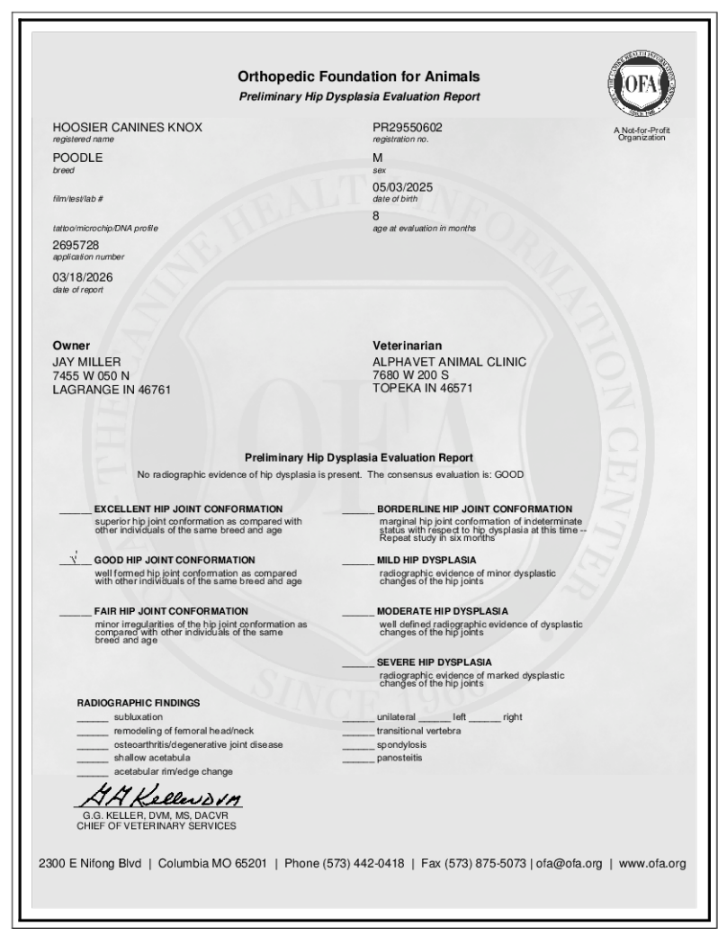 Knox is a friendly, eager-to-please poodle who comes from excellent bloodlines. He carries exceptional genetics that allow him to produce both Traditional Tri-Color and Merle Tri-Color Bernedoodles. Knox has a wonderful temperament and is a great addition to our breeding program. Knox comes from health tested parents.