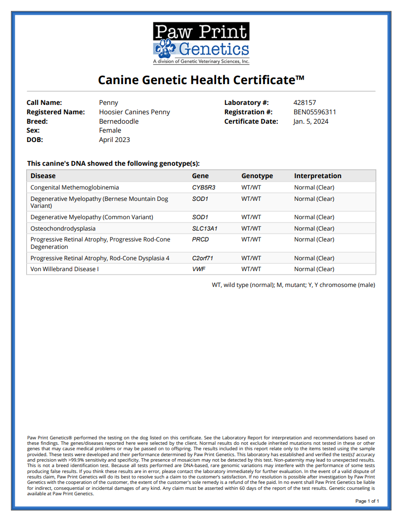 Penny is a friendly and well-mannered Mini Bernedoodle with a soft, easy-to-maintain coat. Her gentle, lovable nature and sociable personality make her a joy to be around, and she’ll be an ideal mother to beautiful Multi-Gen Mini Bernedoodles.