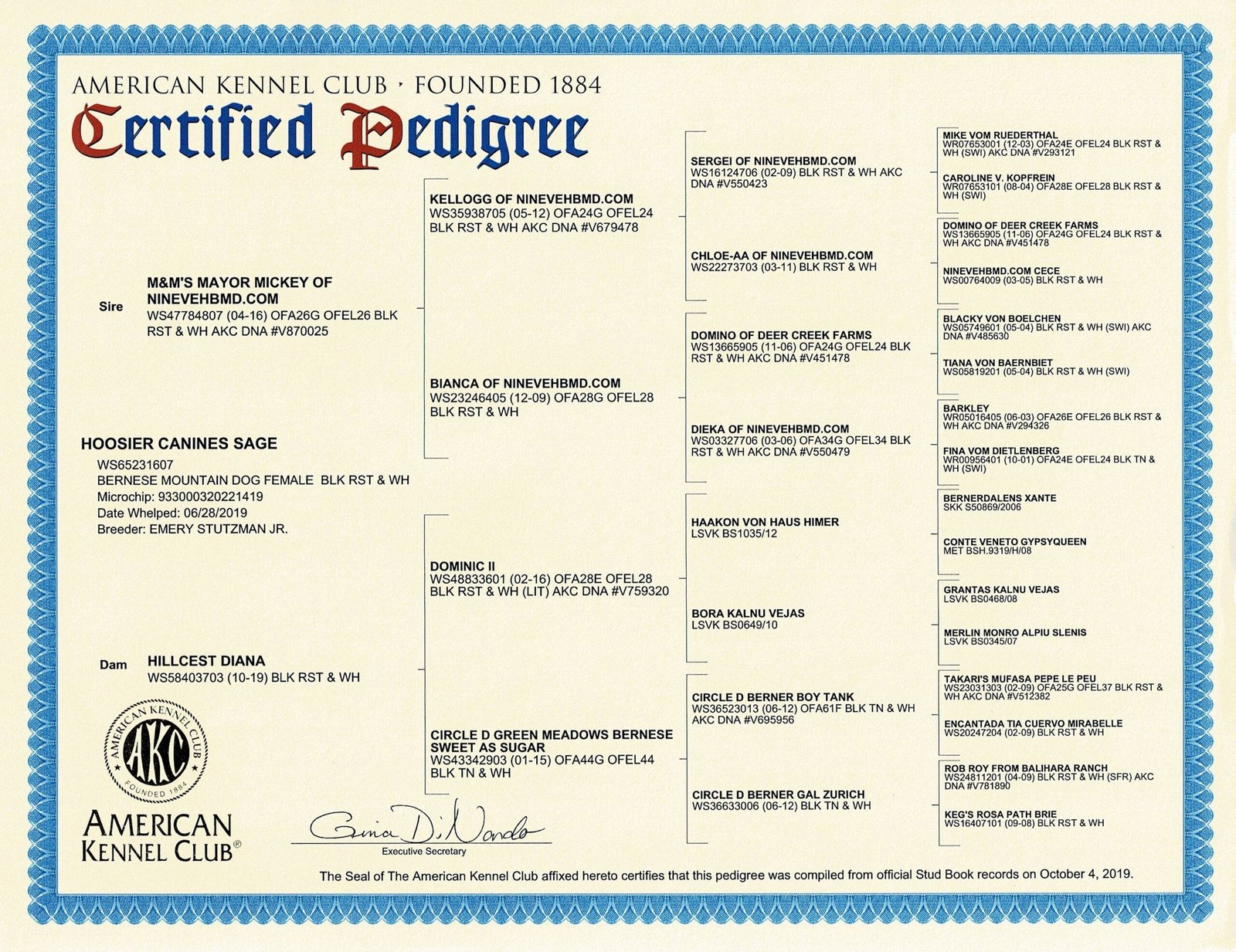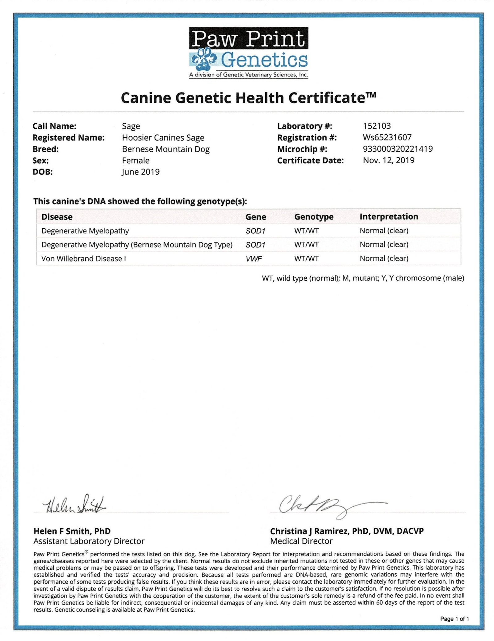 Sage comes from a great line of health tested Bernese Mountain Dogs. With a lot of Champions on her mothers side! She is happy, loving, very docile and just a lot of fun! She has the most beautiful coat!!