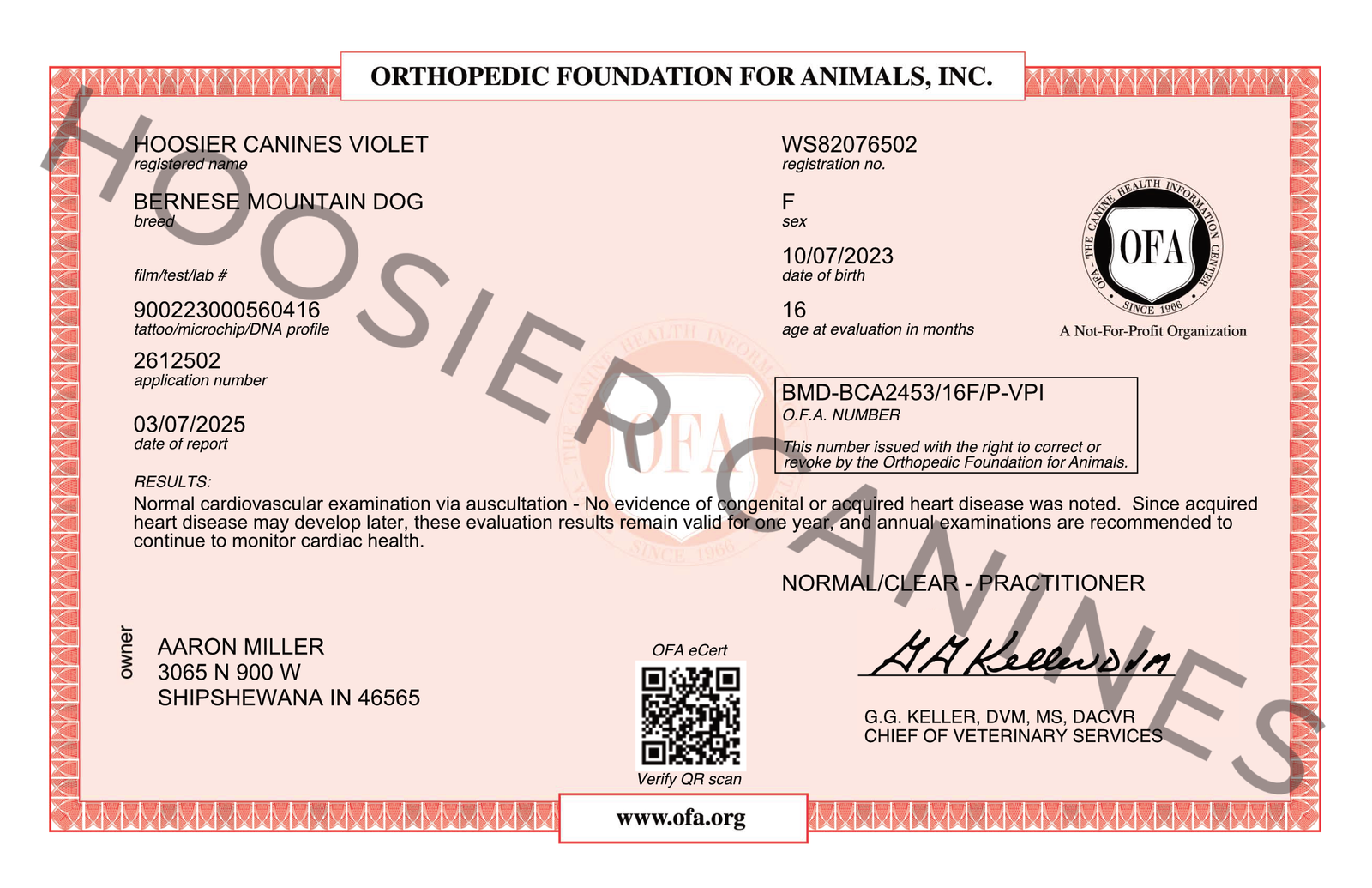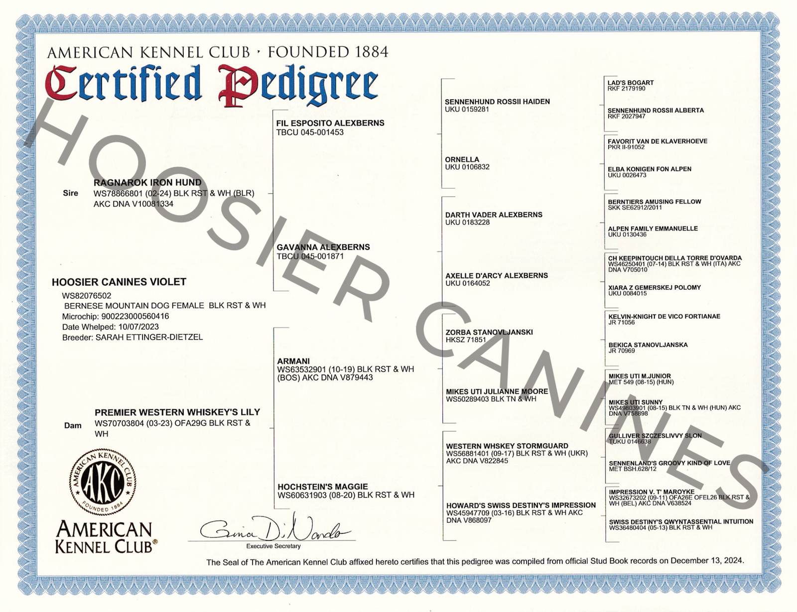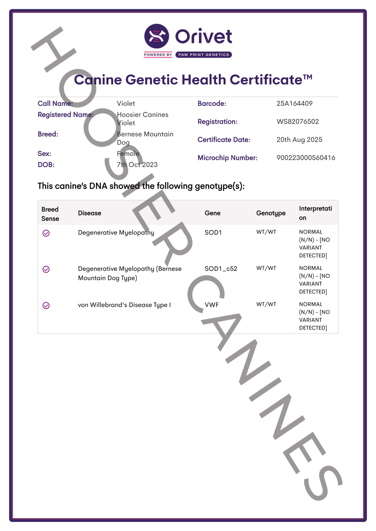 Violet is a beautifully built Bernese Mountain Dog with a calm and affectionate disposition. Her sturdy structure and classic breed conformation are matched by her gentle personality. She comes from imported Russian championship bloodlines, combining excellent structure with a even-tempered personality.